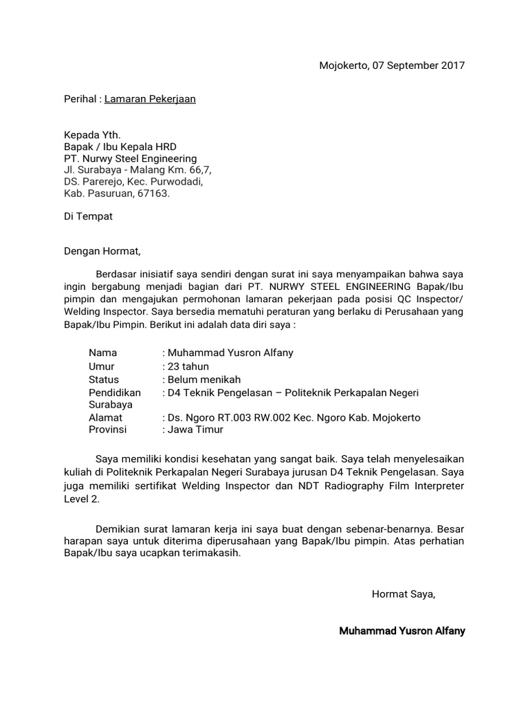 Contoh Surat Lamaran Yusron Pt Nurwy Steel Engineering Pdf